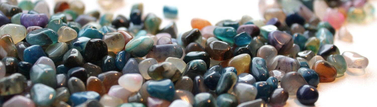 Några exempel på stenar du ser på bilderna här är tex Aventurin (grön), Ametist (lila), Citrin (gula), Jaspis, Rosa kvarts (rosa), Bergkristall (genomskinlig ofärgad), Tigeröga (brun/senapsgul), Kalcedon, Karneol (orangeröd). Du kan läsa mer om några av dessa på sidan om stenar »